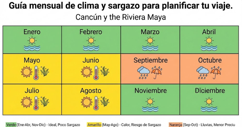 Julio – Agosto: Vacaciones familiares, calor intenso, probabilidad de sargazo alta.